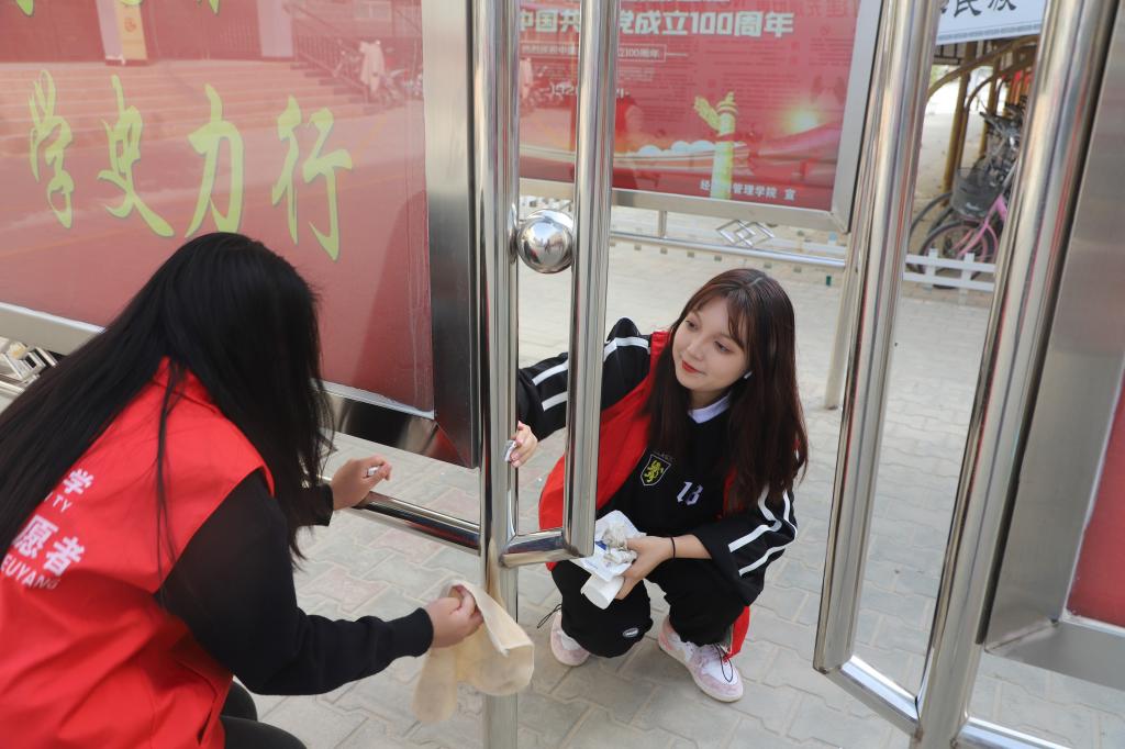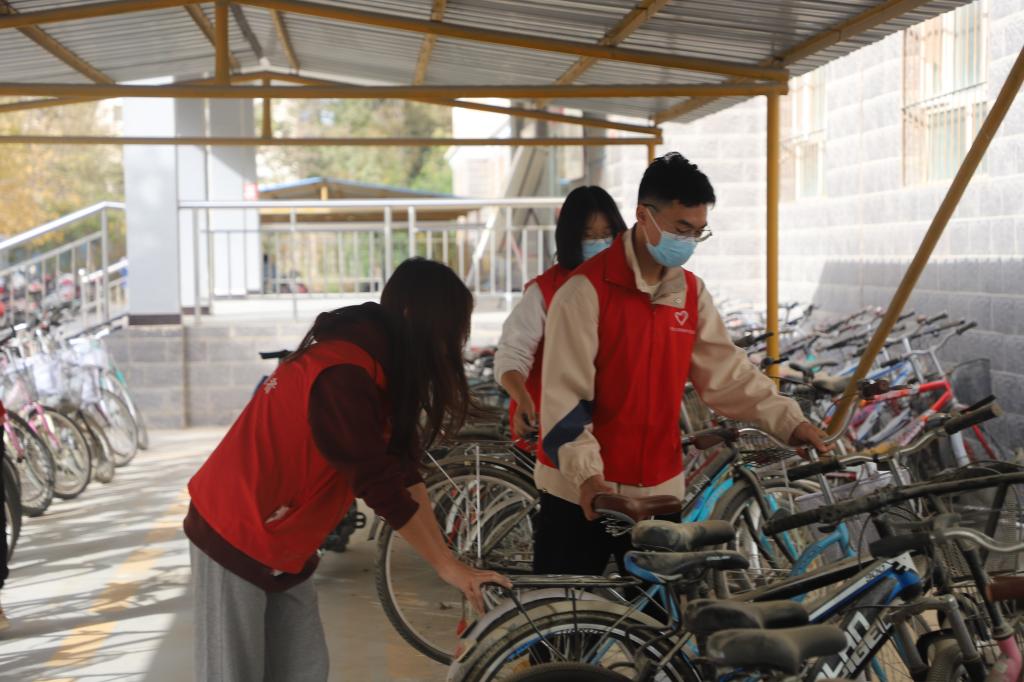 期间,每一位志愿者都不怕苦、不怕累,认真清扫垃圾、整理自行车、仔细擦拭公式牌,最终在他们的努力下停车棚区域焕然一新。