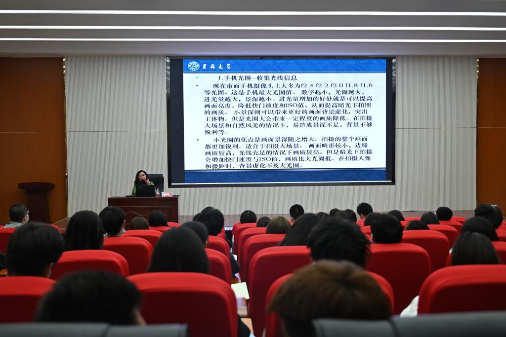 傅菁林从手机摄影和手机图像处理两大方面入手进行讲解,她以实例讲述了画面视觉、摄影艺术的把握,并邀请同学们当场实践。