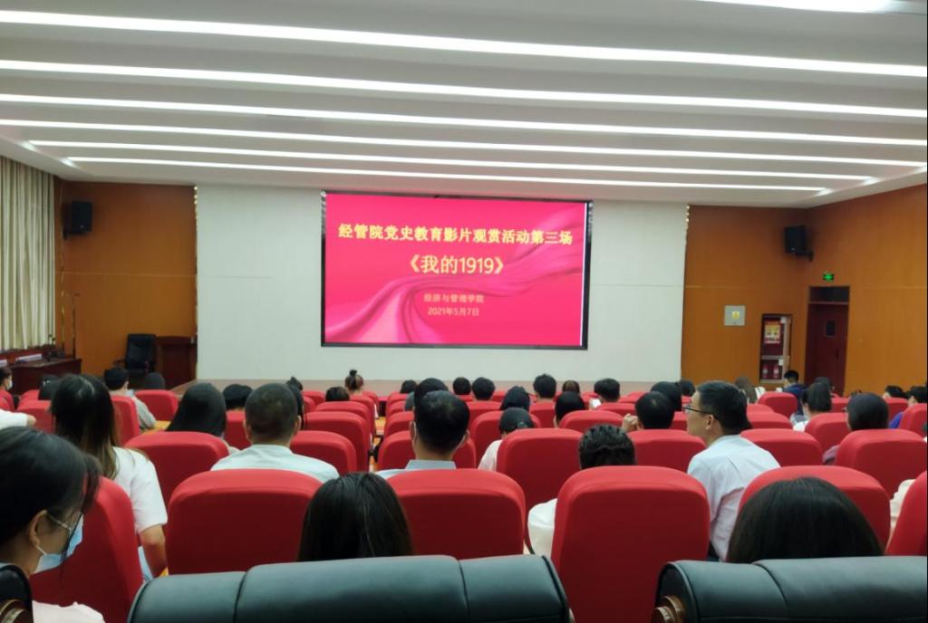 5月7日晚,经管院党史教育影片观赏活动第三场在新文科楼504报告厅开展,放映影片《我的1919》。学院党委书记田国林和兵团党史学习督导组成员出席活动,学院师生代表和部分教职工家属等123人观看了影片。
