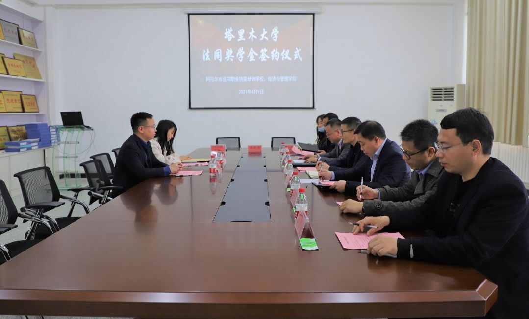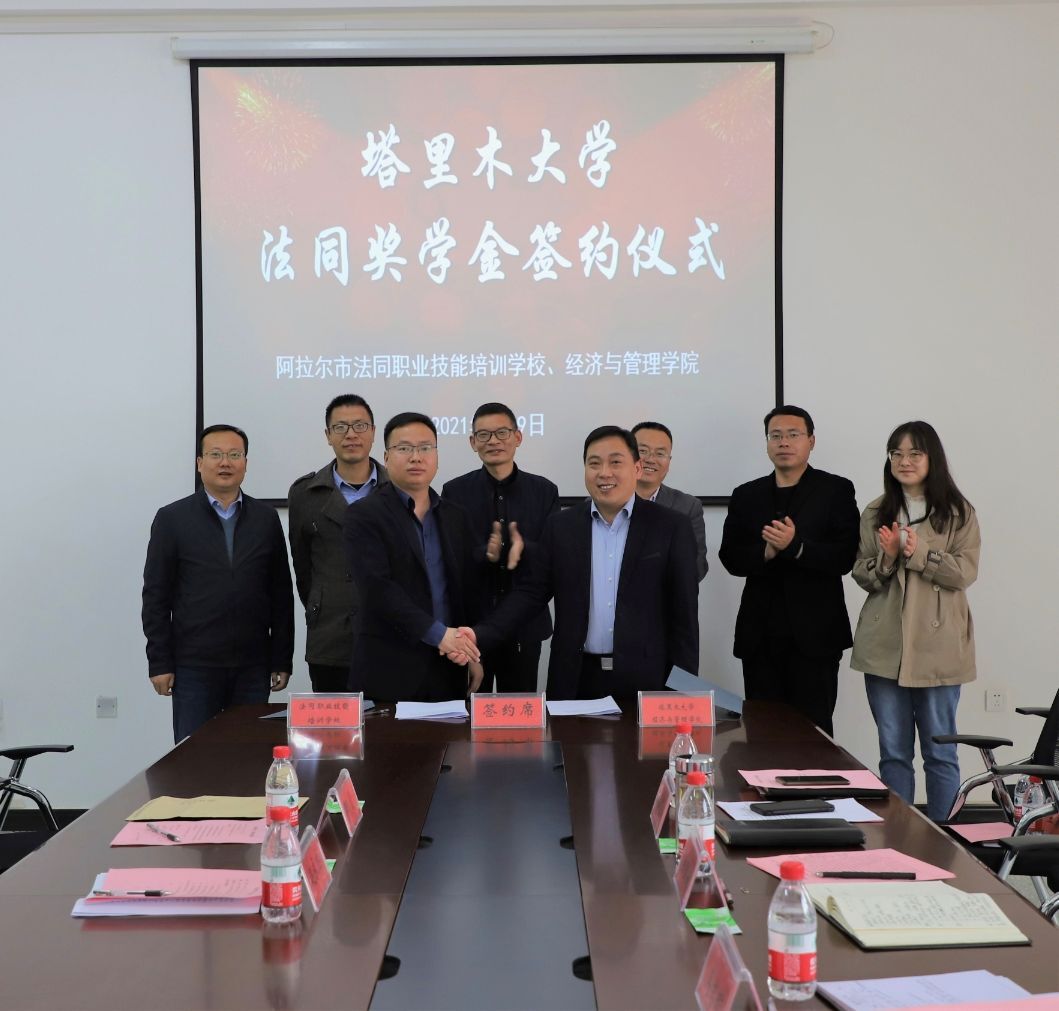 4月9日上午,经济与管理学院与阿拉尔市法同职业技能培训学校举行“法同奖学金”签约仪式。学院党委书记田国林、党委副书记、院长蒋志辉、新疆阿拉尔市法同职业技能培训学校执行董事、校长赵永杰、办公室主任田曼出席签约仪式,学院有关人员参加仪式。仪式由学院党委副书记谷建杰主持。