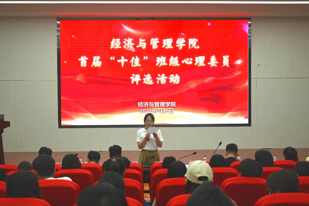 阳光心“理”,你我同行。5月8日晚,经管院于新文科楼504举办首届“十佳”班级心理委员评选活动,经管院团委副书记王春霞,机电院教师朱吉魁,经管院辅导员张居一、宋哲坤担任评委,共有11名班级、宿舍心理委员参赛。