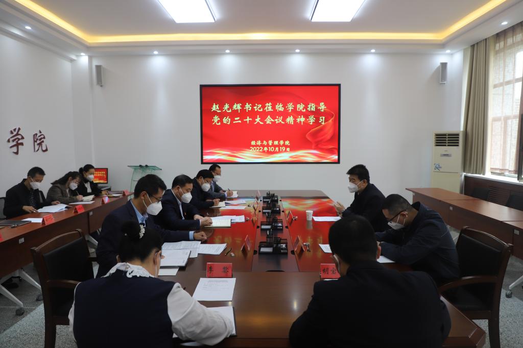 10月19日下午,校党委书记赵光辉莅临学院指导学习党的二十大精神工作安排部署情况,座谈会在文科实验楼209会议室进行,学院领导班子成员、各党总支书记、办公室主任参加。