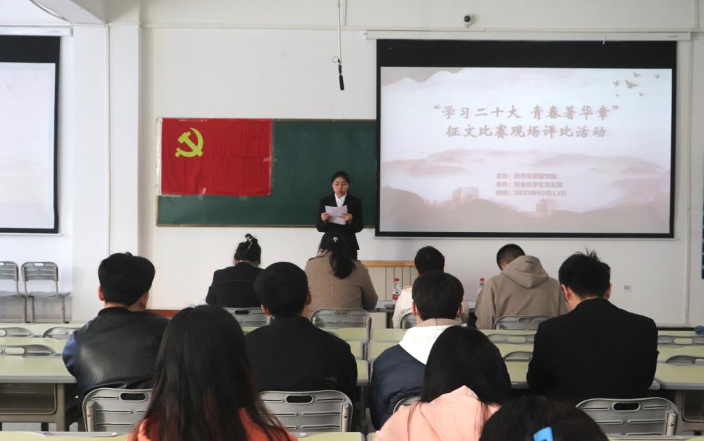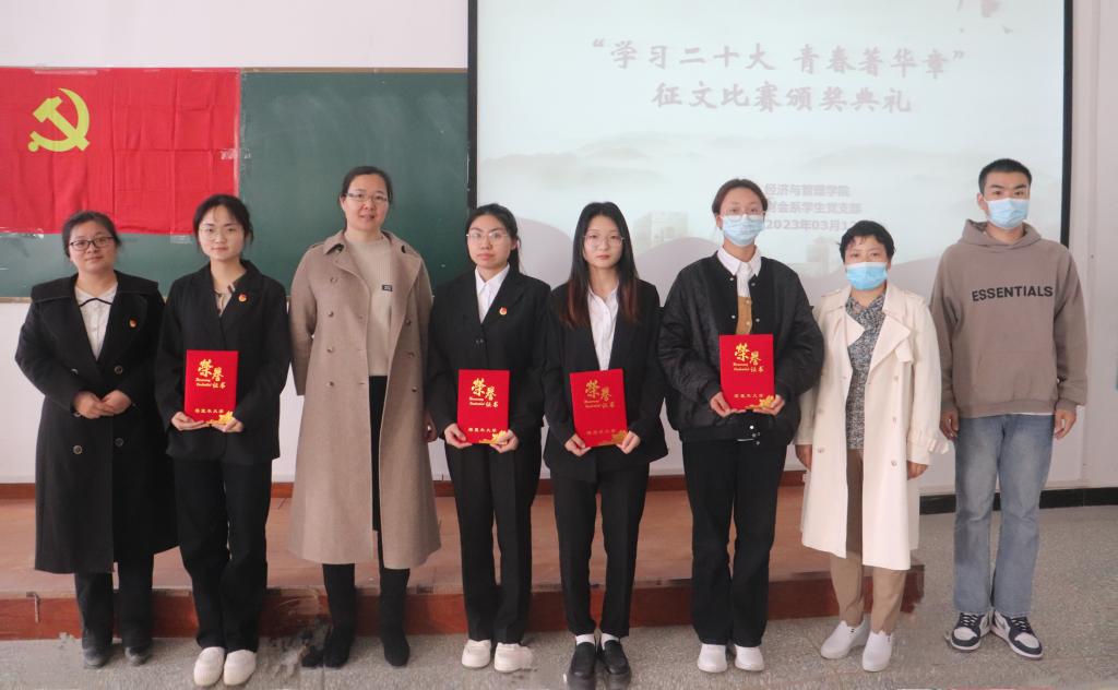 为学习宣传贯彻党的二十大精神,响应习近平总书记“当代中国青年生逢其时,施展才干的舞台无比广阔,实现梦想的前景无比光明”的号召,引导广大学生党员发挥青年担当,勇做时代新人,3月12日,财会系学生党支部在新文科楼218面向经济与管理学院全体学生开展了“学习二十大,青春著华章”征文比赛现场评比暨颁奖活动,参与同学近100人。通过激烈的角逐,评选出了一等奖1名,二等奖2名,三等奖4名。由财会系总党支书记翟少红、财会系主任黄德霞、财会系学生党支部书记徐爱勤、经贸系学生党支部书记徐振威分别为获奖同学颁奖。