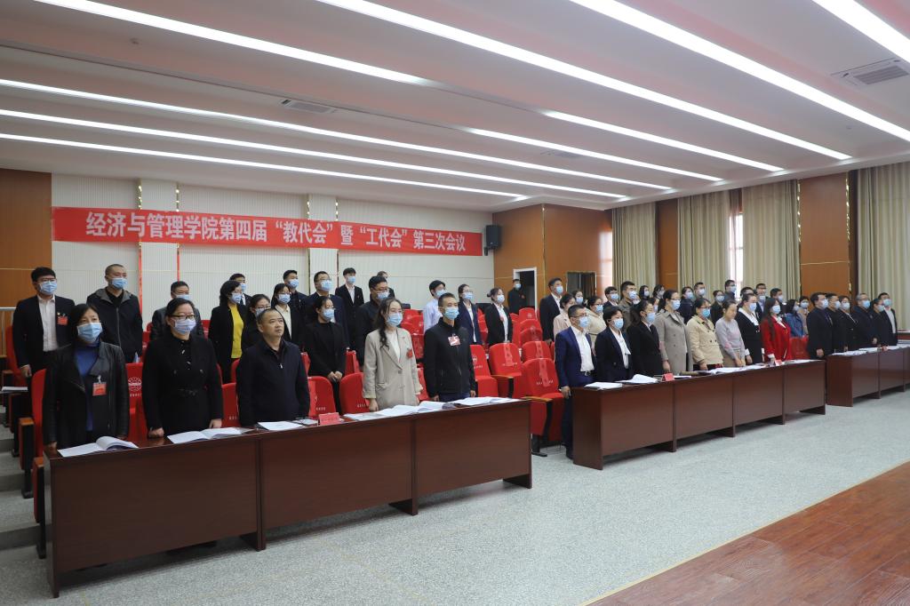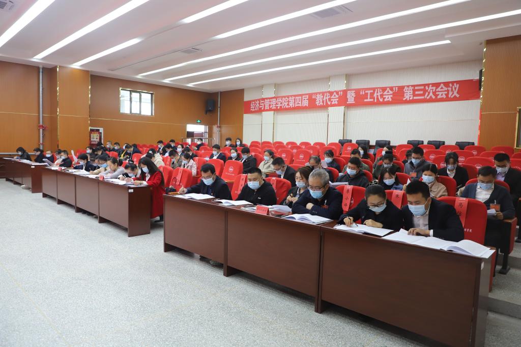 4月8日上午,塔里木大学经济与管理学院第四届“教代会”“工代会”第三次会议在新文科楼报告厅504开幕。学院党委书记蒋志辉,党委副书记、院长王学剑,党委委员、副院长晁伟鹏出席会议,全院正式代表、列席代表参加。会议由晁伟鹏主持。