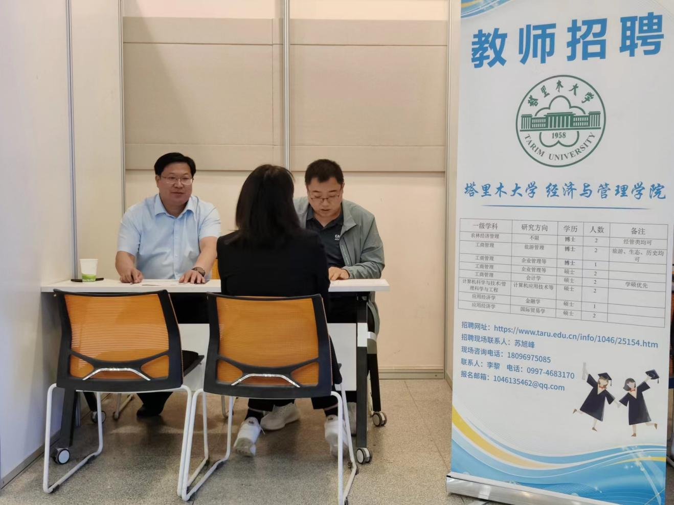 在招聘会上,王院长通过PPT展示向应聘同学介绍塔里木大学的概况、学校的发展史和未来发展方向、人才需求等,招聘组成员通过面对面交流了解应聘学生的专业能力、爱好特长、就职期望等。在王院长的带领下,全体招聘组成员昼夜兼程、干劲十足、成果显著,本次招聘确定意向应聘者包括1名博士、多名硕士研究生。王院长强调,后期将跟进联系,为应聘人员提供各种后续保障服务,使他们感受到家的关怀。
