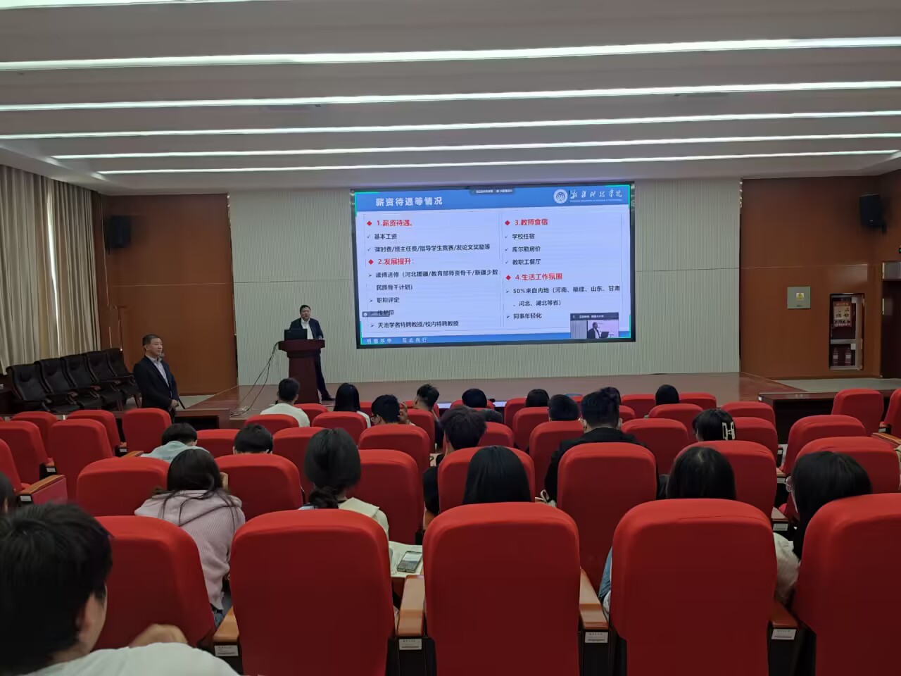 座谈会结束后,王华东、刘强为经济与管理学院研究生们开展了专场宣讲会,从2023届毕业生招聘计划以及薪资待遇、发展提升、教师食宿、生活工作氛围等多个方面进行了详细介绍,并对同学们提出的具体问题进行针对性解答,气氛十分友好热烈。宣讲结束后,到场的毕业生向新疆科技学院递交了个人简历并表明求职意愿。