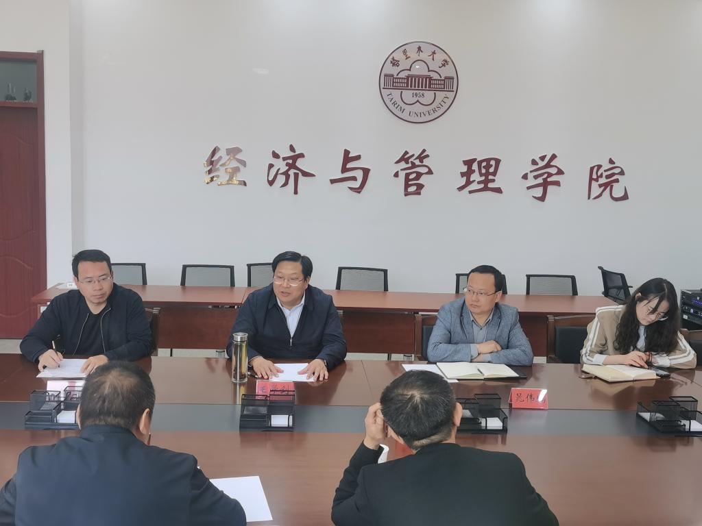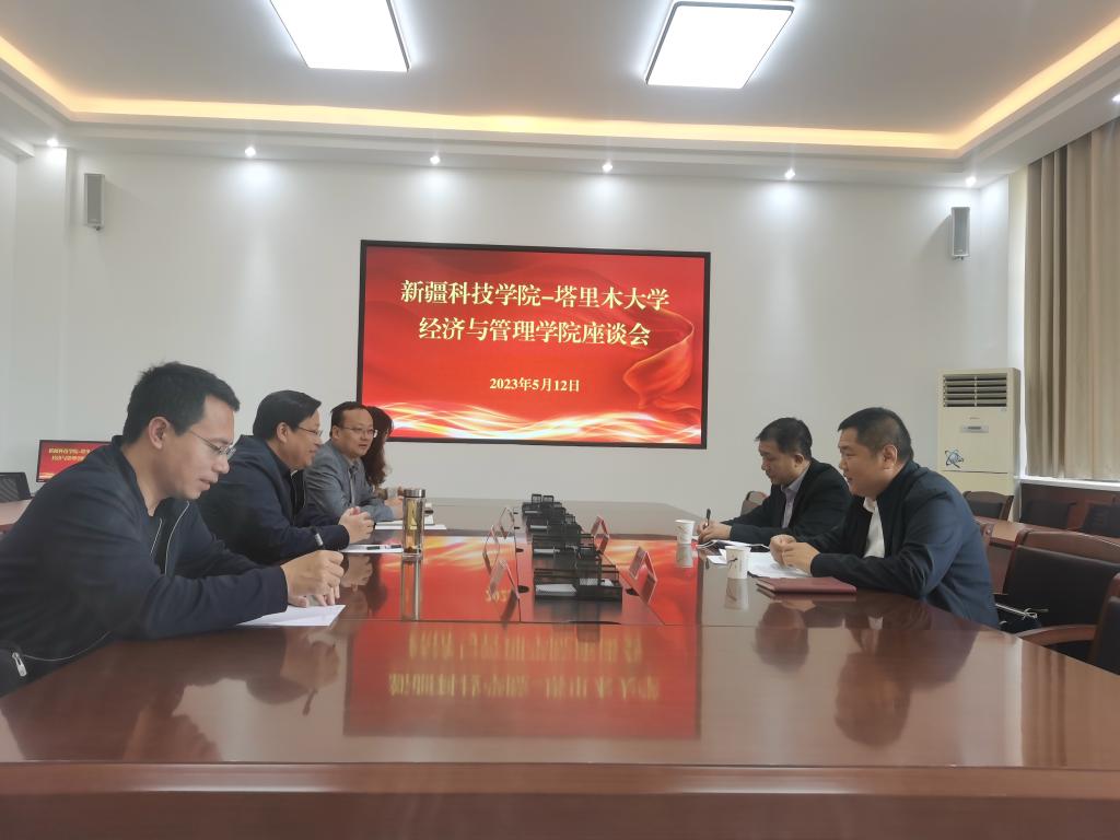为深入开展学习贯彻习近平新时代中国特色社会主义思想主题教育,5月12日上午,经济与管理学院与新疆科技学院经济学院、工商管理学院开展座谈会在新文科楼209会议室顺利举行,参加会议的有新疆科技学院工商管理学院党总支副书记王华东、经济学院党总支副书记刘强、塔里木大学经济与管理学院党委副书记、院长王学剑,党委委员、副院长晁伟鹏,工商管理系总支书记胡宝华,科研与研究生管理副主任王春霞,座谈会由王学剑主持。