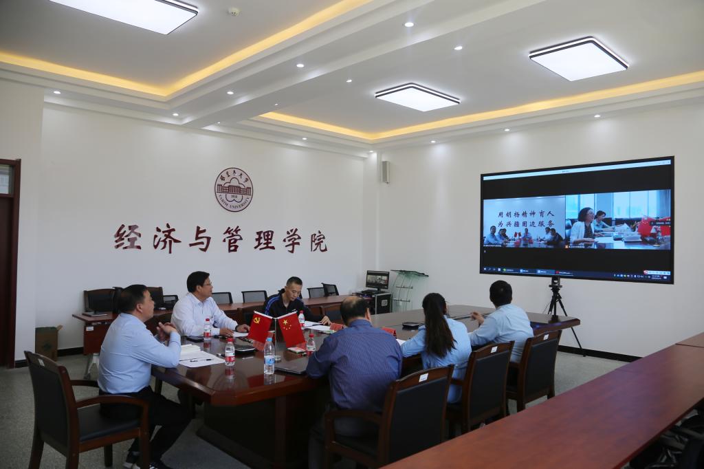 为学习贯彻习近平新时代中国特色社会主义思想主题教育,坚持将理论学习与调查研究贯通起来,切实推动学院高质量发展。5月15日,经济与管理学院与东华大学旭日工商管理学院开展联学共建学习会。会议采取“上线+线下”相结合的方式进行,由东华大学旭日工商管理学院党委书记林嵘主持,双方学院领导班子成员以及东华大学教授、经济与管理学院银龄教师徐明参加。