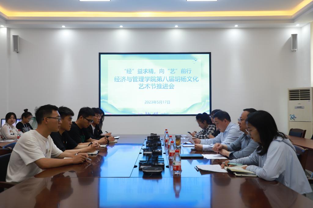 为深入推进学习贯彻习近平新时代中国特色社会主义思想,进一步推进学校文化艺术节筹备工作,弘扬胡杨精神,5月17日下午,经济与管理学院在文科实验楼209会议室开展“经”益求精,向“艺”前行第八届胡杨文化艺术节推进会,学院党委书记蒋志辉,党委委员、副院长晁伟鹏出席本次大会。院团委老师及团委学生会各部门干部近20人参加大会。