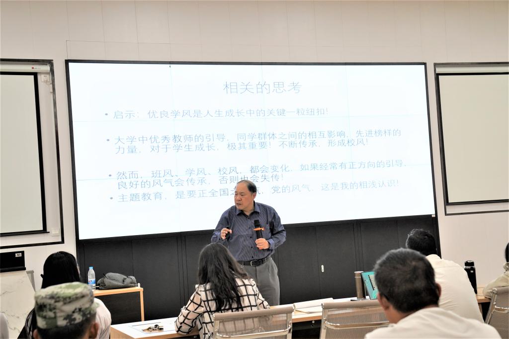 徐明老师围绕二十大精神讲解了六次主题教育,从班风建设和人才培养方面提出了理论学习产生的启示,并向参会的教师、同学们分享了在上海交通大学、西敏学院等高校学习工作50年的经历以及关于大学教改与育人工作的思考。在提问互动环节,徐明老师就服务质量标准的建立、专业建设的特色等问题作了专业解答,师生受益匪浅。