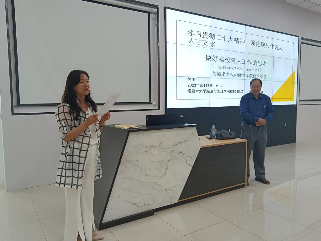为学习贯彻二十大精神,强化现代化建设人才支撑,5月17日旅游管理系在文科实验楼503实验室举办了胡杨经管大讲堂2023年第四期专题学术讲座。本次讲座由东华大学教授、博士生导师,东华大学旭日管理研究所所长、塔里木大学银龄教师徐明老师担任主讲,讲座题目为《做好高校育人工作的思考》,旅游管理系全体教师、旅游管理专业2020级、2021级、2022级全体同学现场聆听了讲座。