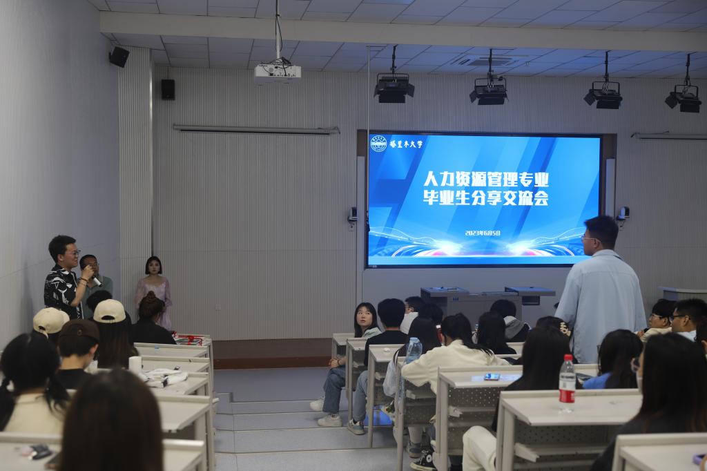 又是一年毕业季,会者定离,一期一祈。来自五湖四海的莘莘学子按下选择的按钮,蓄势待发,以梦为马,奔赴祖国大江南北,不负韶华。6月5日,经济与管理学院人力资源管理专业2023届毕业生经验分享交流会在综合楼阶教2召开,邀请了5位大四毕业生针对就业、考公、升学、基层就业等多个方面进行经验分享,以帮助在校学生明确未来规划,理清发展思路。本次活动由司睿琪同学主持,工商系人力资源管理专业教师及大三学生共100余人参加。