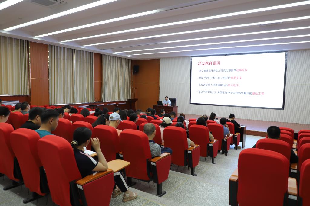 为深入学习习近平总书记关于教育的重要论述,推进主题教育走深走实。6月9日下午,学院党委副书记、院长王学剑为学院全体在校教师讲授“深入学习习近平总书记关于教育的重要论述——推动新时代高等教育高质量发展”专题党课,在文科实验楼504报告厅进行。