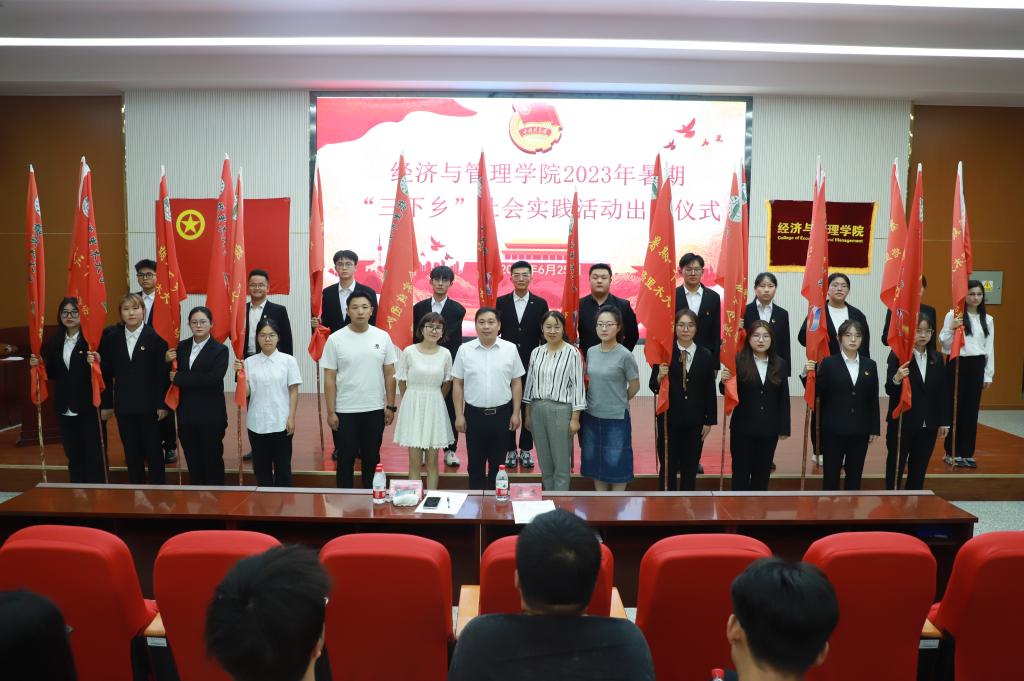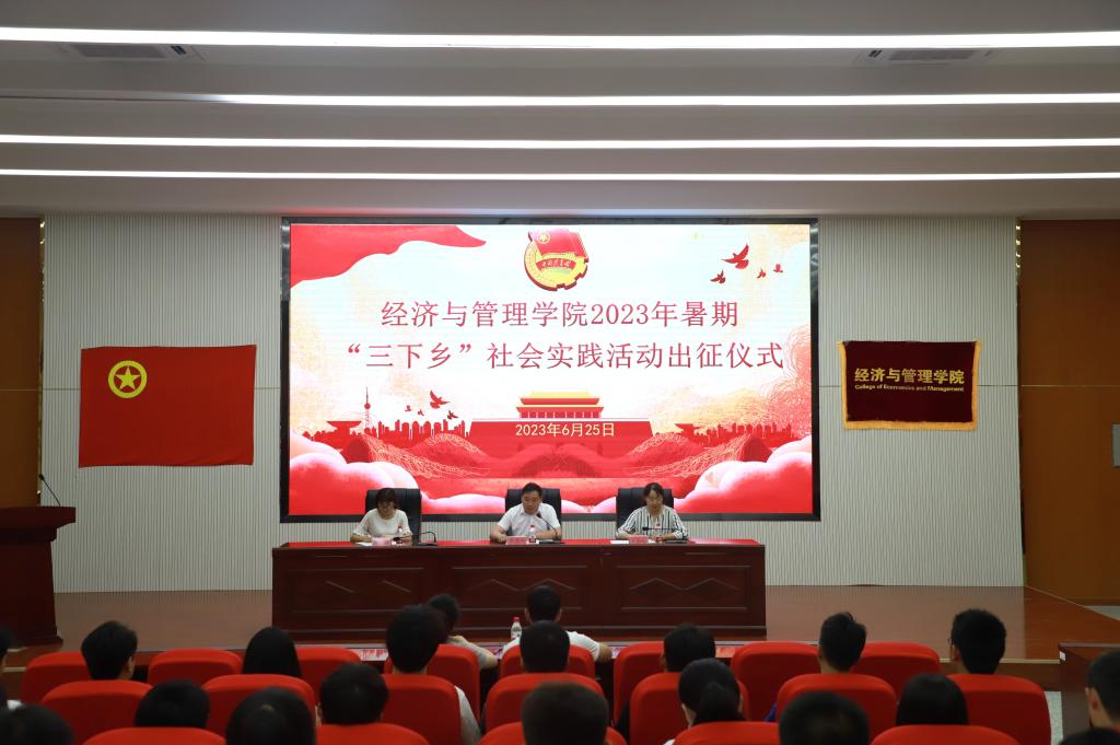 为深入学习宣传贯彻习近平新时代中国特色社会主义思想,全面贯彻落实党的二十大精神,团结带领广大青年在社会实践中受教育、长才干、做贡献,引领学生立志做有理想、敢担当、能吃苦、肯奋斗的新时代好青年。6月25日下午,经济与管理学院2023年暑期“三下乡”社会实践活动出征仪式在文科实验楼504报告厅举行。经济与管理学院党委书记蒋志辉出席本次出征仪式。学院党委委员、学办主任王小云,学办团委辅导员老师,学院90支三下乡团队代表参加了活动。