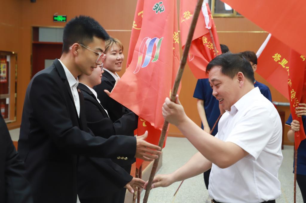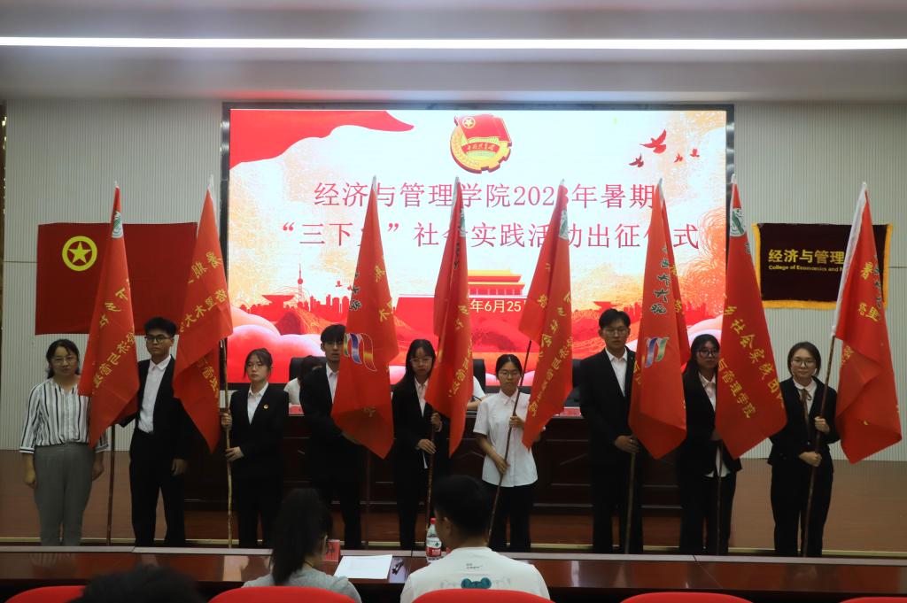 青春诠释青年担当,薪火相传接续奋斗。王小云老师为院级立项团队的成员代表授旗。蒋志辉书记为校级立项团队一一授旗,并宣布经济与管理学院2023年暑期“三下乡”社会实践团启程出征。