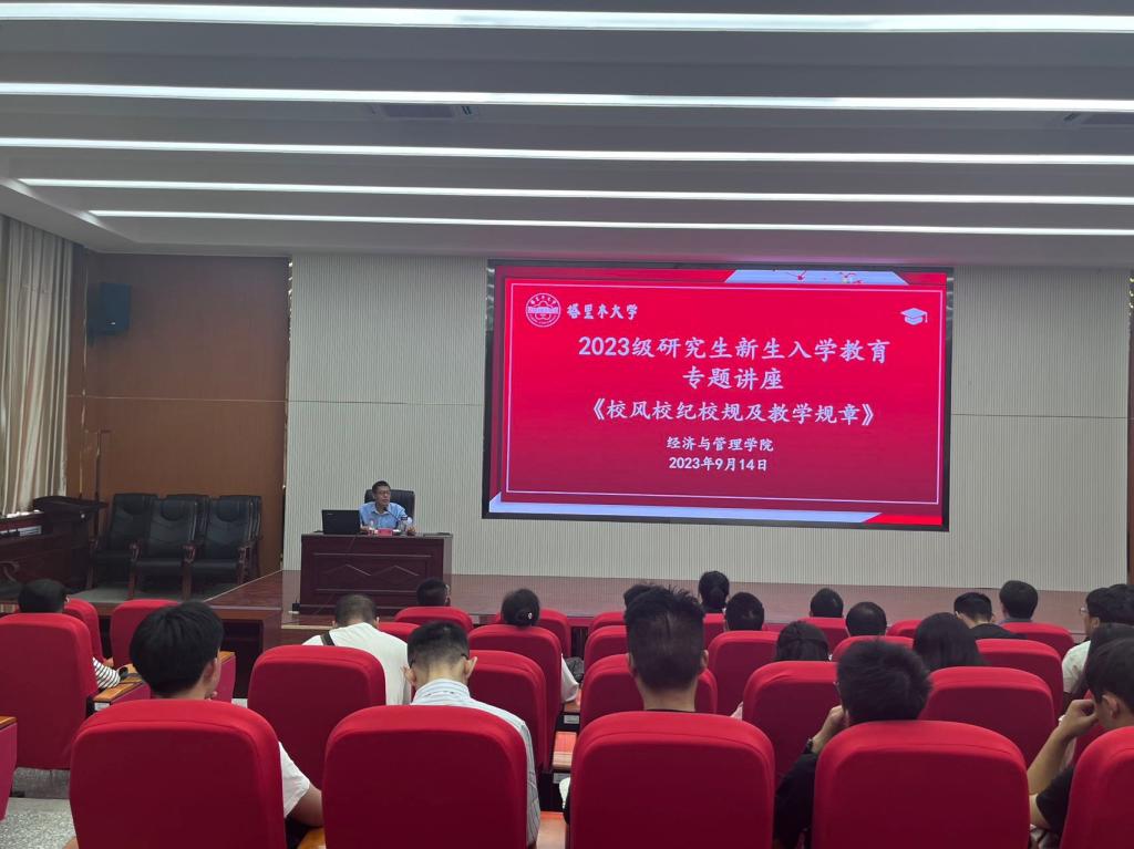 9月14日上午,经济与管理学院在文科实验楼报告厅504开展了新生入学教育主题讲座——校风校纪校规及教学规章。本次专题讲座学院党委副书记、纪委书记朱哲为主讲。2023级全体研究生新生参加了本次讲座。