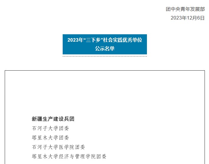 为深入总结交流经验、选树典型宣传、推动引领示范、激励广泛参与、发挥育人实效,经基层申报、省级团委审核推荐、组织评议等环节,12月6日,团中央青年发展部对2023年全国大中专学生志愿者暑期文化科技卫生“三下乡”社会实践活动总结通报结果进行公示,我院团委荣获2023年全国大中专学生暑期文化科技卫生“三下乡”社会实践优秀单位。