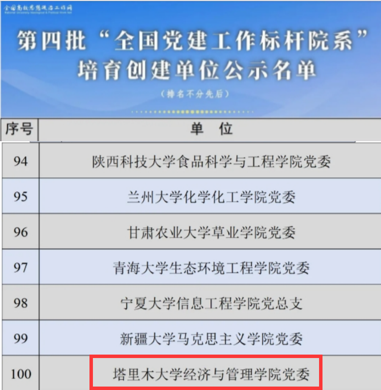 近日,教育部思想政治工作司发布了《教育部思想政治工作司关于第四批新时代高校党建示范创建和质量创优工作遴选结果的公示》,遴选产生了10个全国党建工作示范高校、100个全国党建工作标杆院系、1001个全国党建工作样板支部。学院党委入选“全国党建工作标杆院系”培育创建单位。