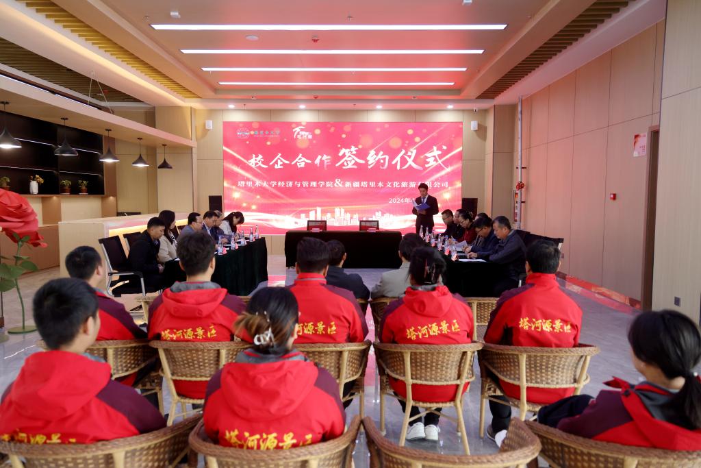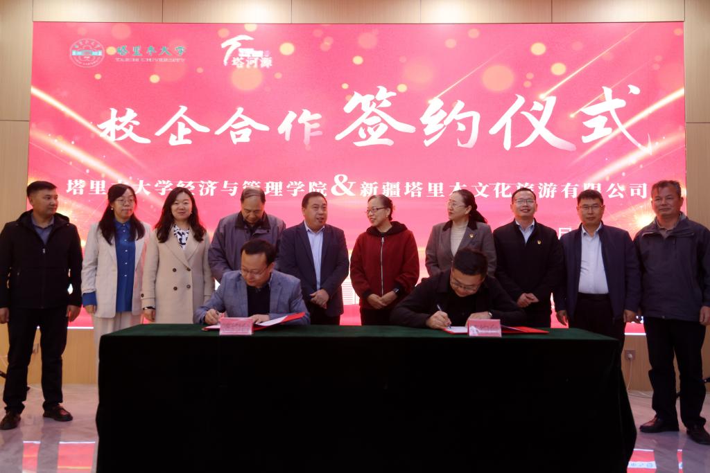 4月3日上午,塔里木大学经济与管理学院与新疆塔里木文化旅游有限公司校企合作签约仪式在十六团塔河园源景区顺利举行。十六团新开岭镇团党委副书记、副政委、工会主席、妇联主席朱美江,经管院党委书记蒋志辉,党委委员、副院长晁伟鹏以及拓华国资公司董事长李洪斌、新疆塔里木文化旅游有限公司执行董事苏宏伟出席签约 仪式,相关单位工作人员参加。