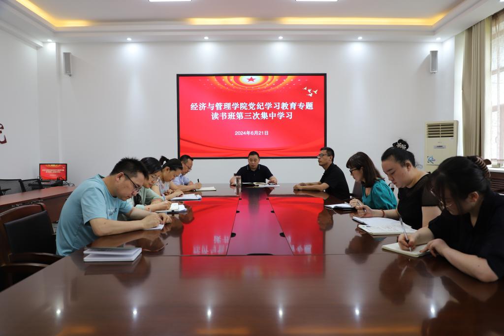6月21日,经济与管理学院党委在文科了实验楼209会议室召开党纪学习教育专题读书班第三次集中学习,学院党委书记蒋志辉主持会议并讲话,学院领导、党委委员、各办公室负责人参加学习。