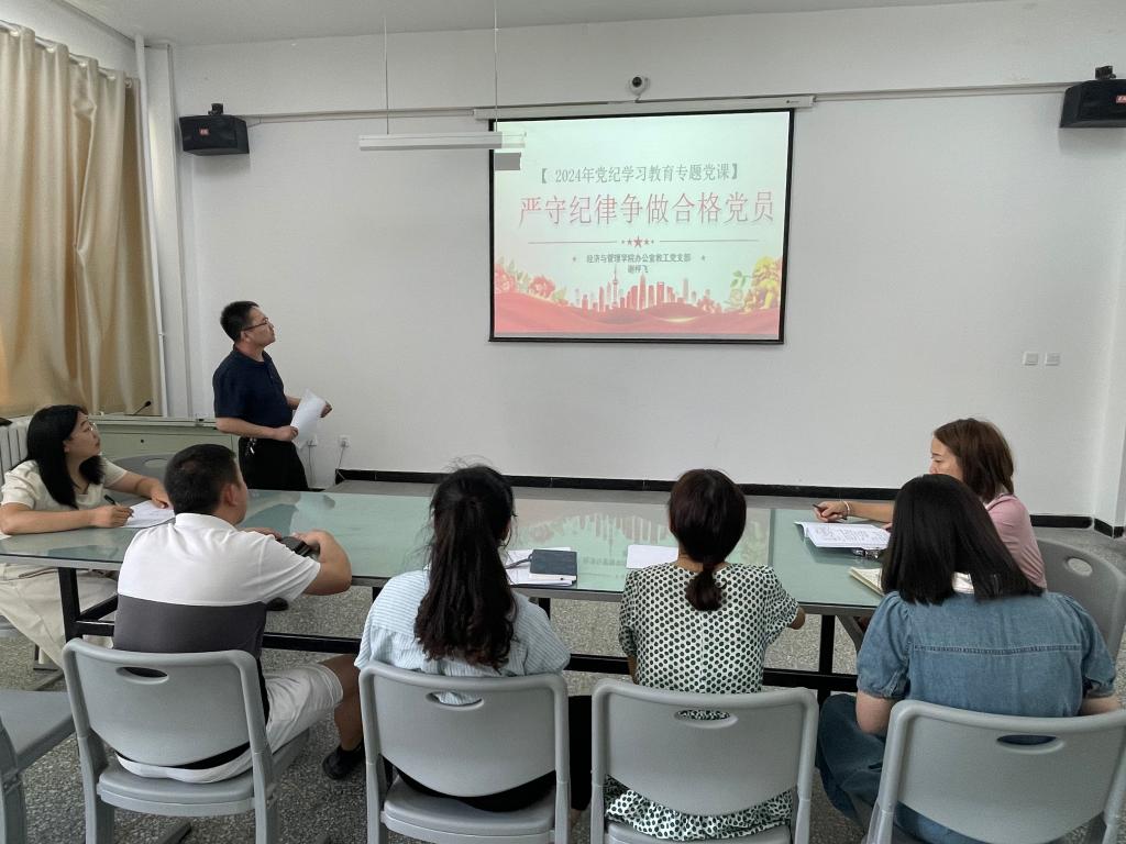 为深入推进党纪学习入脑入心、见行见效,6月26日下午,办公室教工党支部书记谢枰飞在文科实验楼108教室,以“严守纪律争做合格党员”为主题,讲授党纪学习教育专题党课,办公室教工党支部参加。