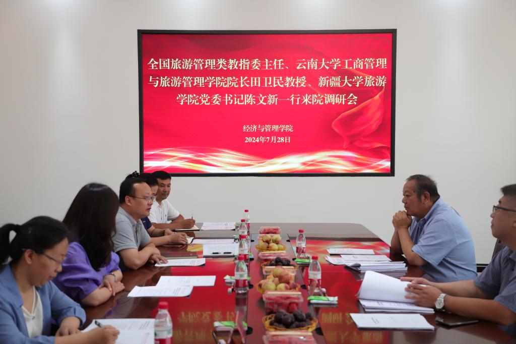 7月28日下午4:30,全国旅游管理类教指委主任、云南大学教授田卫民及新疆大学旅游学院党委书记陈文新一行,来经济与管理学院调研。调研会在文科实验楼209室举行,学院党委委员、副院长晁伟鹏主持会议,旅游管理系在校教师参加了会议。