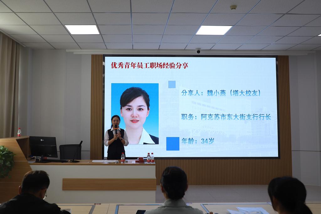 阿克苏市东大街支行行长魏小燕作了热情分享。她表示,作为塔里木大学的校友,非常荣幸站在这里分享她的职场经历,招聘会正是连接校园和职场的重要桥梁,它为我们提供了一个宝贵的平台,让每个大学生都有机会可以与优秀的企业面对面交流,了解行业动态,寻找自己的职业发展道路。