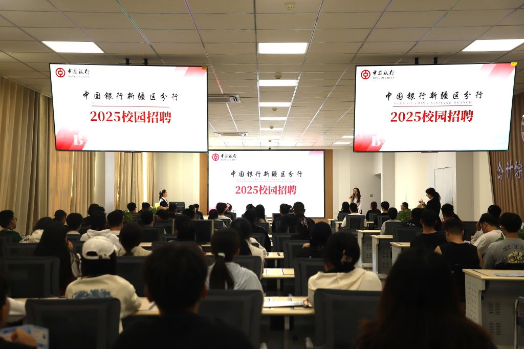 此次招聘宣讲会围绕招聘岗位、招聘流程、薪资待遇、工作环境和人才成长计划面向我校学生展开宣讲。中国银行 有限公司新疆分行人力资源部招聘配置团队主管涂明双说道:“中国银行不仅是一家金融机构,更是一个充满活力和创新精神的大家庭。公司瞄准兵团区域发展战略,充分认识学校对南疆人才的培养是大而深远的,希望同学们在中国银行实现自己的梦想,找到属于自己的舞台。”