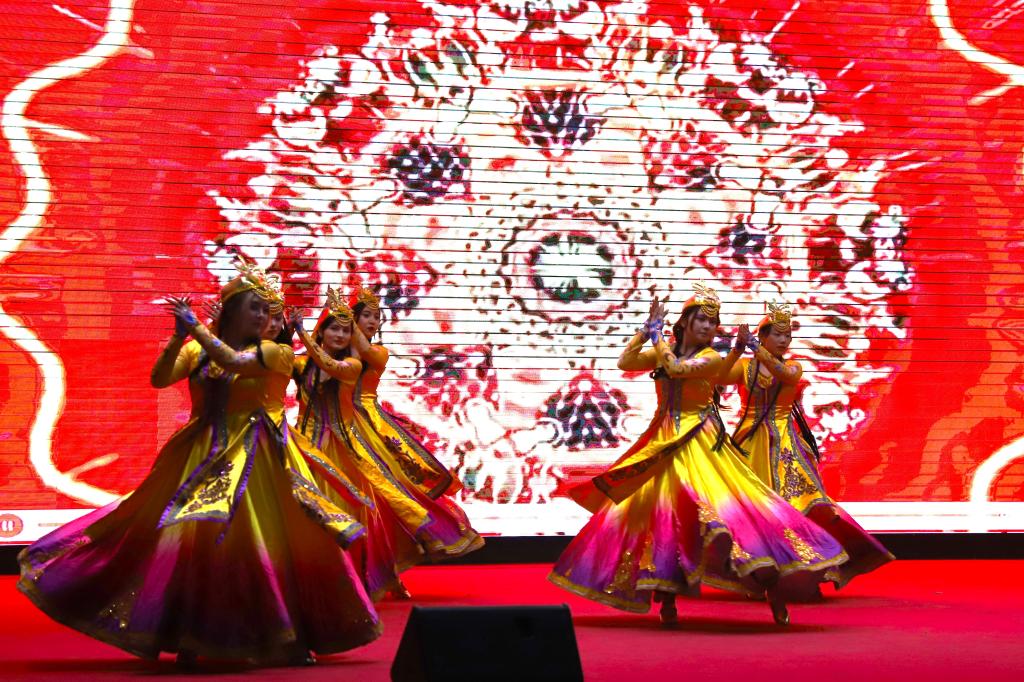 开学典礼暖场环节播放了学校和学院宣传片,并在欢乐的民族舞蹈《舞月新疆》中拉开帷幕。