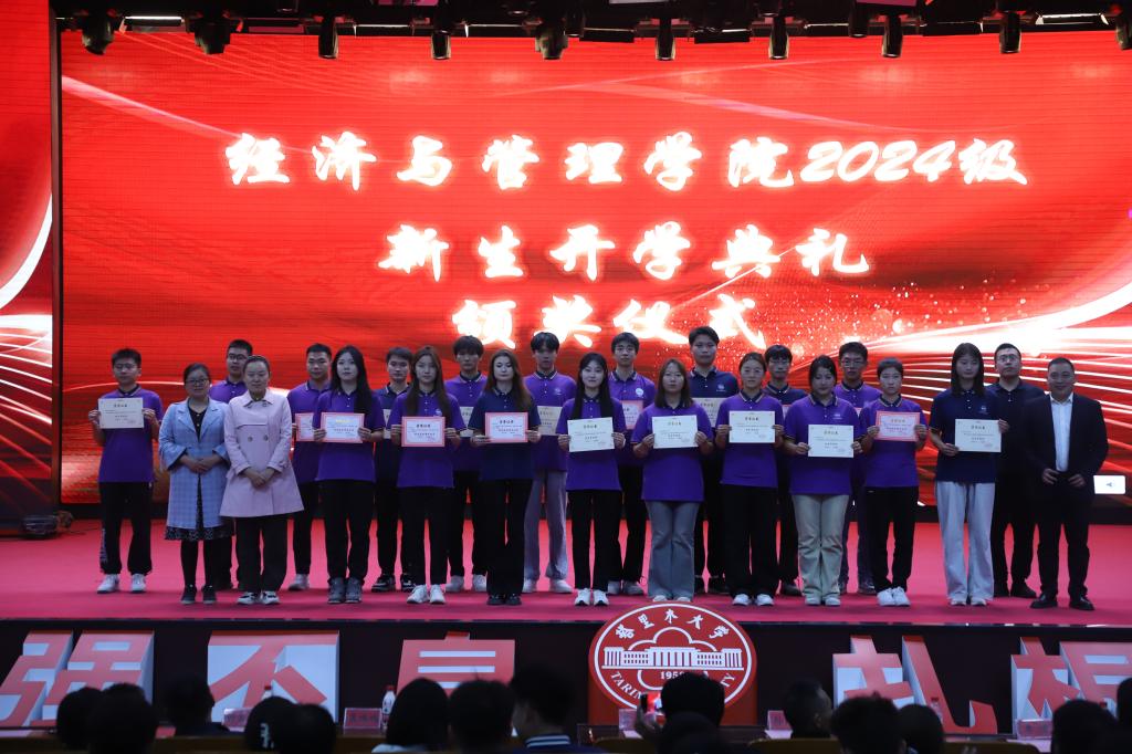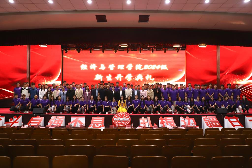 10月15日晚,经济与管理学院于文科楼B座报告厅举行2024级新生开学典礼。学院党委书记蒋志辉、党委委员、各系党总支书记、各系主任,全体辅导员及学院2024级全体本科、硕士新生参加,典礼由学院党委常委、副院长晁伟鹏主持。