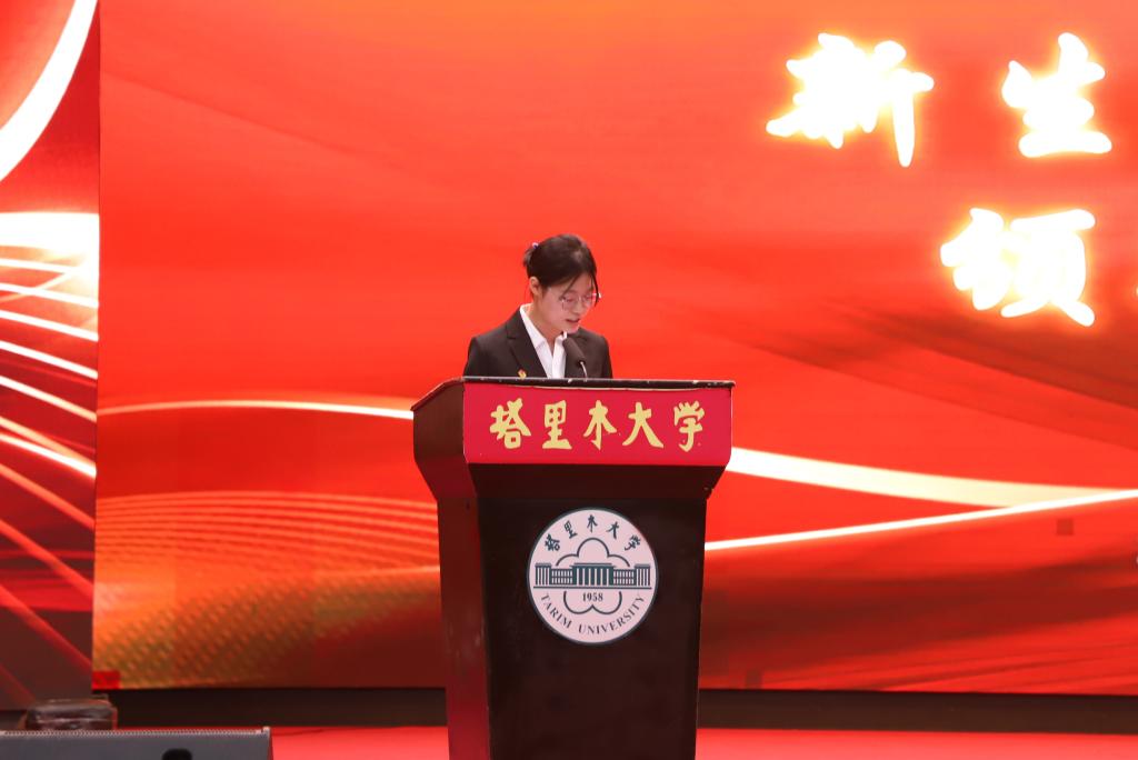 研究生新生代表和本科生新生代表上台发表讲话,他们分别从不同的角度,讲出了对新生的殷切期望,为成为一名合格的金胡杨学子注入信心。