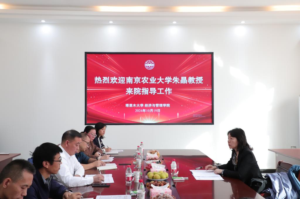 2024年10月18日—20日,第二届环塔里木经济高质量发展论坛在塔里木大学举行,南京农业大学朱晶教授应邀参加论坛做学术报告。10月19日下午4:30,经贸系部分农经专业的教师与朱晶教授在经济与管理学院209会议室举行座谈,座谈由学院党委书记蒋志辉教授主持。