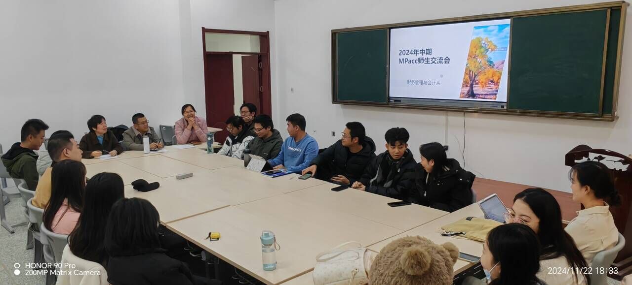 2024 年11月22日,一场以教学质量为核心主题的 MPAcc 师生交流会在文科实验楼406召开。此次交流汇聚了导师、任课教师、MPAcc 在读学生,共同围绕教学模式创新、实践教学开展以及学术与职业平衡等关键议题展开深入探讨,旨在全面提升 MPAcc 教学质量,为培养适应新时代需求的胡杨会计专业人才凝聚智慧与力量。