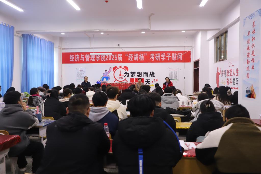 2024年12月11日下午,为鼓励和激发考研学子的斗志和信心,经济与管理学院于新文科楼112举办2025届“金胡杨”考研学生慰问会。学院党委书记蒋志辉,学院党委委员、副院长晁伟鹏、顾继岩,学办主任王小云,辅导员郁轩出席会议。