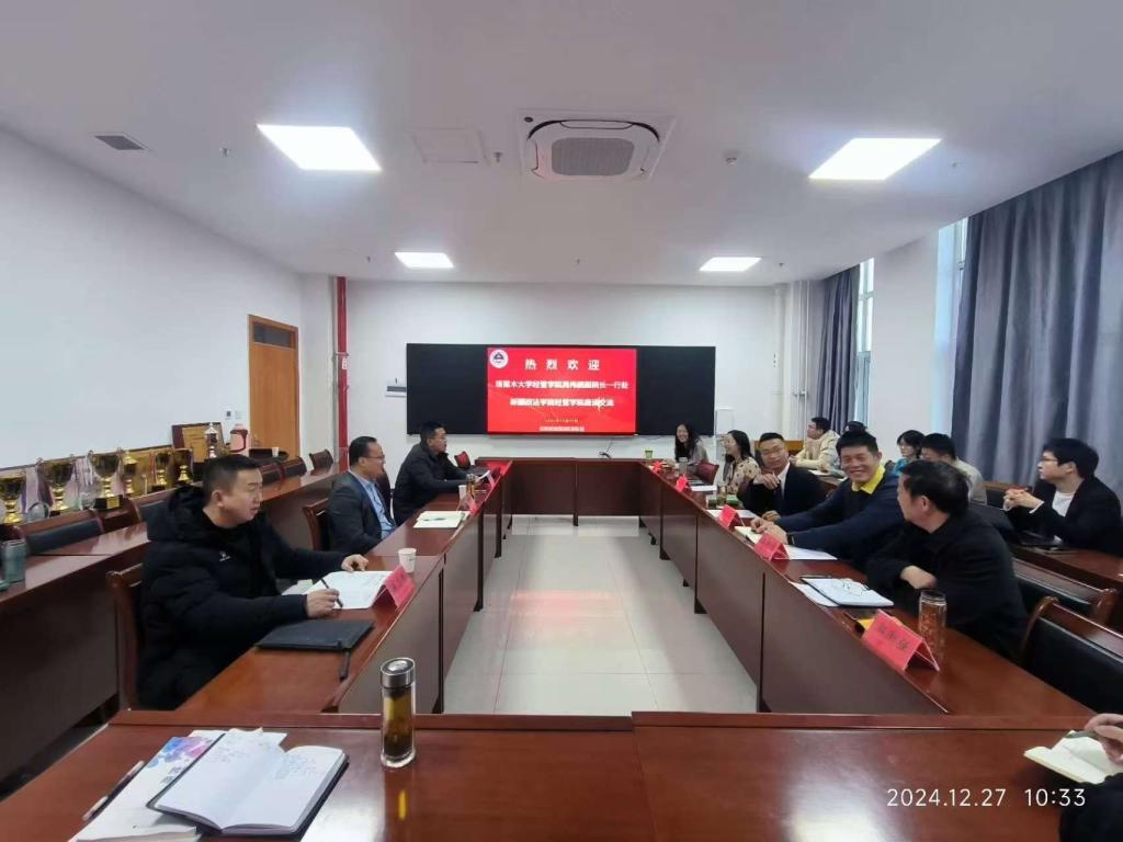 为加强两院的交流合作,我院副院长晁伟鹏、工商系主任马信春、学办辅导员郑志伟一行三人于2024年12月27日受邀前往新疆政法学院经济管理学院交流学习。新疆政法学院经济管理学院负责人孙海军教授主持会议,各系办负责人及部分教师参加。