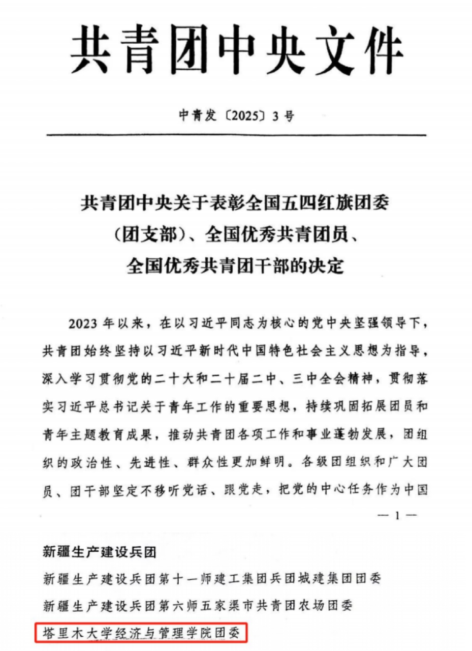 近日,共青团中央发布了《共青团中央关于表彰全国五四红旗团委(团支部)、全国优秀共青团员、全国优秀共青团干部的决定》(中青发〔2025〕3号),经济与管理学院团委荣获“全国五四红旗团委”称号!这是共青团中央授予基层团组织的最高荣誉,也是兵团高校中唯一的表彰对象。
