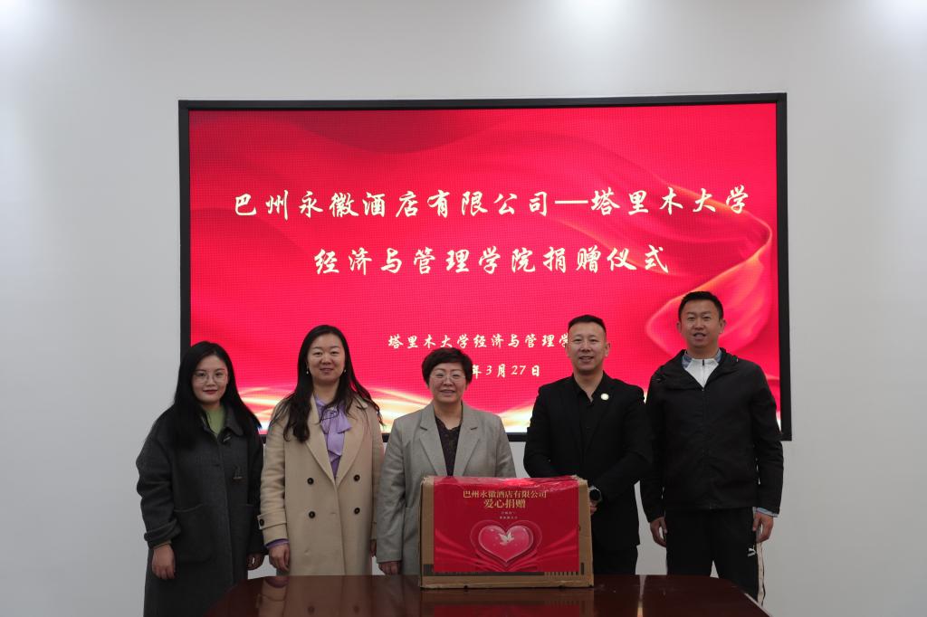 会议开始由李俊老师介绍了双方参会人员,顾继岩副院长对陈长兴部长的到来表示热烈欢迎,并强调此次合作对学院实践教学体系建设的深远意义。参会人员共同观看了经济与管理学院、巴州永辉酒店有限公司宣传片。顾继岩副院长指出,学院始终秉持“知行合一、服务社会”的办学宗旨,此次合作是深化应用型人才培养模式改革的重要举措。陈长兴部长高度认可塔里木大学的人才培养质量,表示永辉酒店作为新疆本土酒店行业领军企业,将以实习基地为纽带,提供岗位实践、职业导师及就业绿色通道等资源,助力学生提升职业技能。陈长兴部长代表永徽酒店向学院捐赠了30个篮球,30个足球及50个羽毛球。