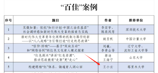 教育部高校思想政治工作队伍培训研修中心(山东大学)对2024年高校思想政治工作优秀文章征集活动中遴选出的“百佳”论文、“百佳”案例以及优秀论文、优秀案例进行公示,学院王小云教授题为《构建胡杨“红”体系,铸魂育人润心田》案例入选全国高校思政教育“百佳”案例。