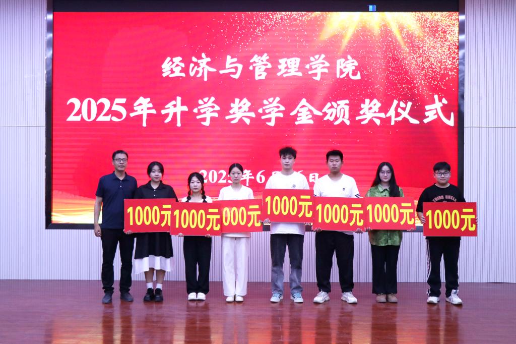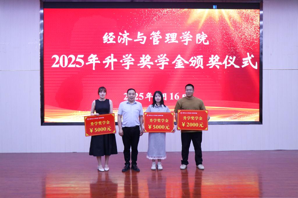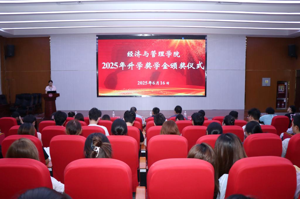 为激励经管学子深造进取,弘扬学术追求,6月16日晚上,经济与管理学院2025年升学奖学金颁奖仪式在文科实验楼504报告厅举行。学院党委书记蒋志辉,党委副书记、纪委书记朱哲,党委委员、副院长李博,各系主任,教务办主任,学办主任,科研办主任及全体研究生、部分本科生参加,仪式由李博主持。
