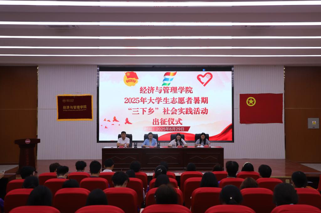 为深入学习贯彻习近平新时代中国特色社会主义思想和党的二十大精神,兵团精神和胡杨精神、老兵精神,6月29日,经济与管理学院2025年大学生志愿者暑期“三下乡”社会实践活动出征仪式在文科试验楼504举行。党委委员、学生办公室主任王小云,全体辅导员及三下乡团队代表参与。