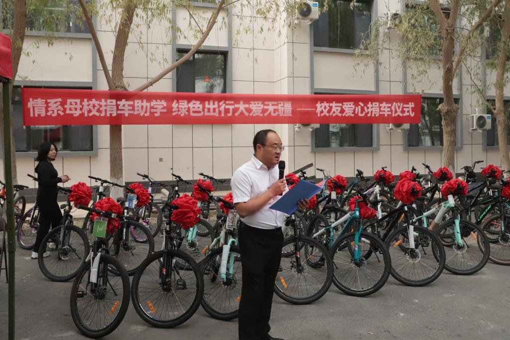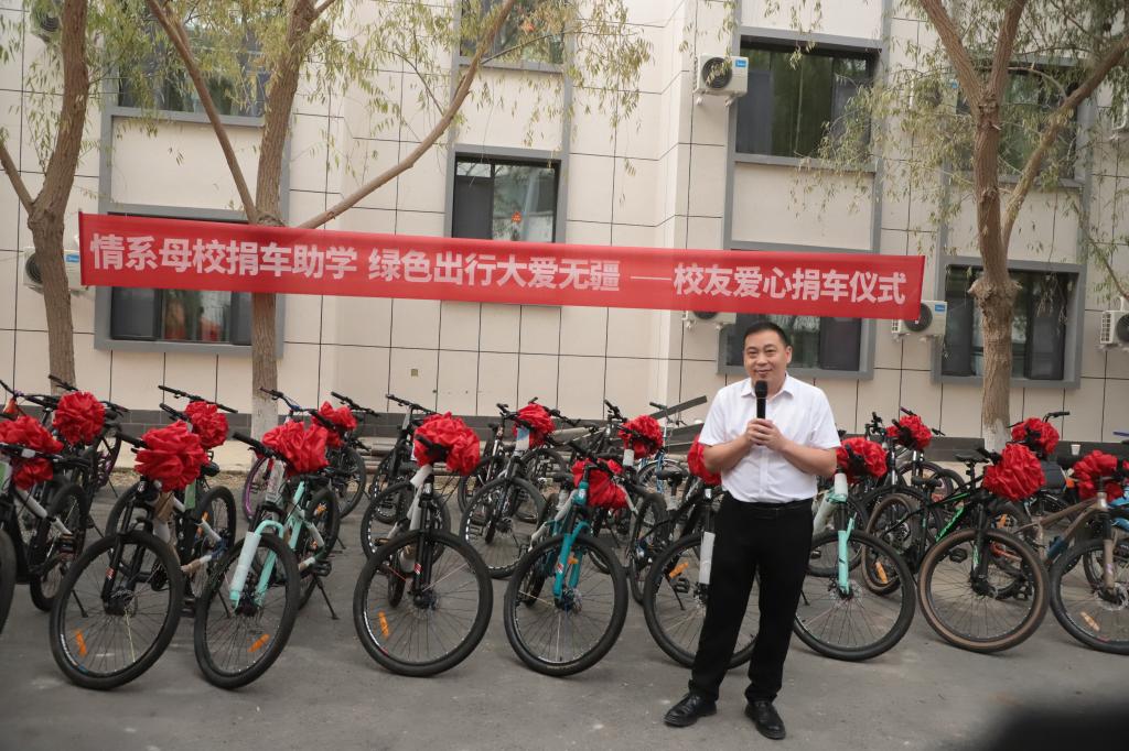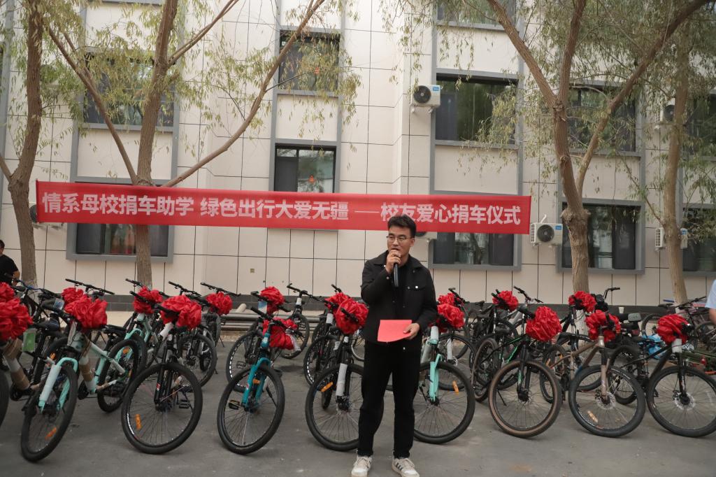 仪式伊始,陈曙书记首先介绍了到场领导和嘉宾。随后,优秀校友杨虎上台发言。他深情回顾了在母校求学的点滴岁月,由衷感谢母校和老师们的悉心培养,并说明了此次捐赠的初衷——希望自行车能为新同学们的校园生活提供便利,践行绿色出行理念。同时,他也表达了对母校深深的感恩与回馈之情,并鼓励2025级新生珍惜大学时光、勤奋学习,今后也能以实际行动回馈母校、贡献社会。