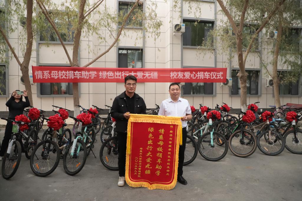 9月7日上午,学院在西一宿舍楼门前举行“情系母校捐车助学,绿色出行大爱无疆——优秀校友爱心捐赠仪式”。我院优秀校友2021届人力资源管理专业毕业生杨虎向学院捐赠30辆自行车,助力新生绿色出行。党委学生工作部部长谷建杰,学院党委书记蒋志辉,学院党委委员、党委副书记陈曙,全体辅导员,2025级新生代表及部分家长代表共同出席仪式,见证这一暖心时刻。