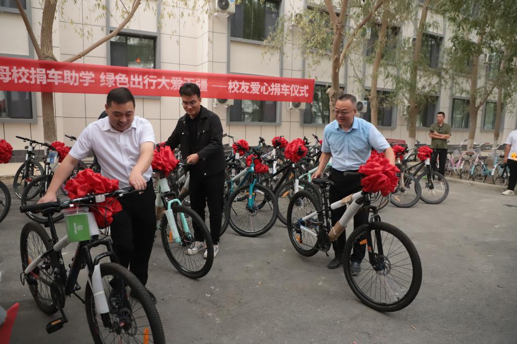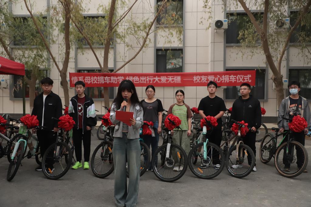 仪式中,谷建杰部长、蒋志辉书记与杨虎共同为各专业最高分的新生发放捐赠自行车。受捐新生代表国际经济与贸易2025级2班李彤彤进行发言,她诚挚感谢校友的捐赠,表示会好好利用自行车,绿色出行、努力学习,不辜负期望,未来也会传递这份爱心。