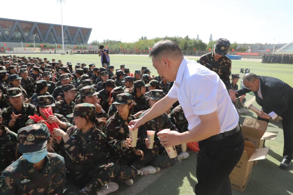 蒋书记满怀深情寄语新生,勉励大家既要坚定意志、在成长中锤炼过硬品格。他鼓励新生立足入学新起点,树立远大志向,以专注之心深耕学业,充分依托学院优质平台,在逐梦之路上脚踏实地、奋勇前行。随后学院领导与全体辅导员分工协作,为每位新生发放一杯温热奶茶并为军训教官发放了慰问品。