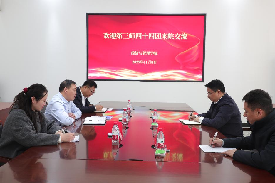 2025 年 11 月 8 日上午,塔里木大学经济与管理学院党委书记蒋志辉与第三师四十四团政委贺明君一行在文科实验楼 212 会议室举行座谈交流,双方围绕乡村振兴、科研合作、人才培养等核心议题展开深度探讨,明确校地协同发展的重点方向与实施路径。
