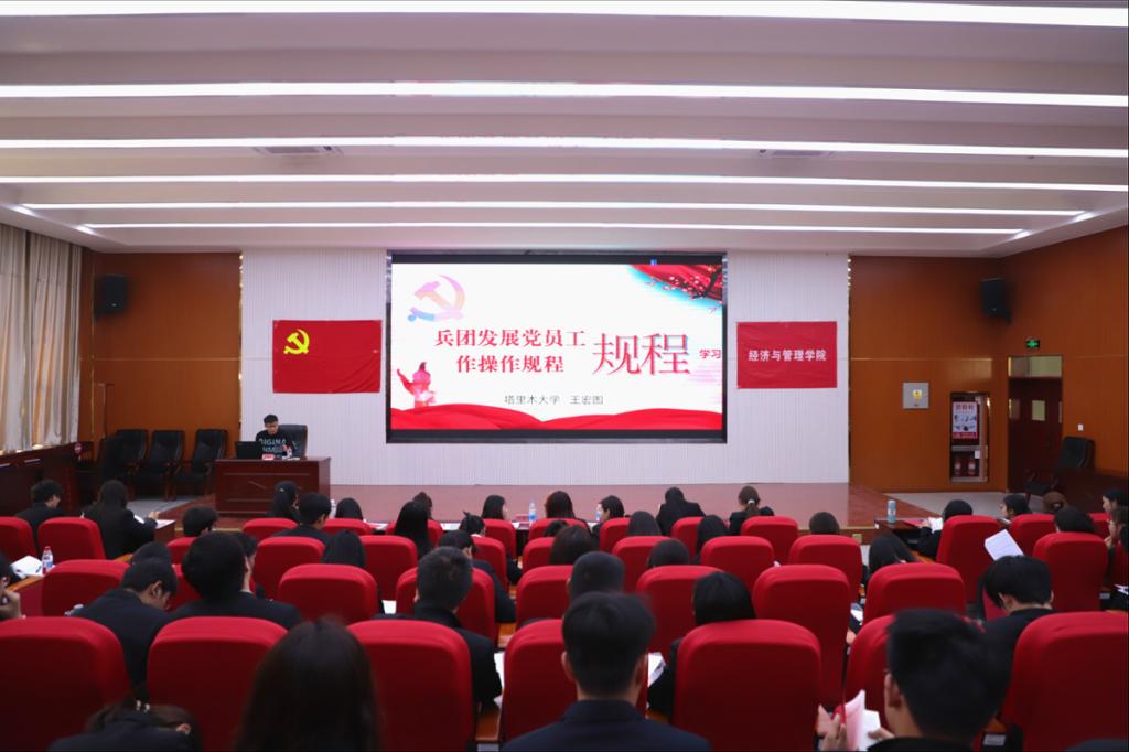 3月28日,经贸系学生党支部书记王宏图为学员讲授《兵团发展党员工作操作规程》,详细讲解党员发展流程,引导学员牢记党的宗旨使命,加强政治修养。
