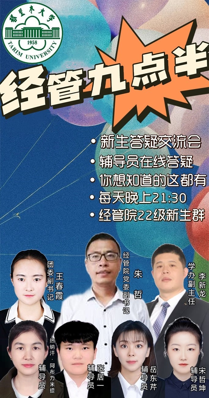 “宿舍是几人间呀”“团员关系怎么转”“大一可以考四级吗”“大一要上哪些课”“报道需要带哪些东西”……塔里木大学开学倒计时,萌新们虽未报道入校,经管院的辅导员们可没闲着,面对萌新和家长们的疑虑和困惑,8月12日晚,经管院党委副书记朱哲携全体辅导员在2022级新生群开展线上《经管九点半》首场新生答疑交流活动。