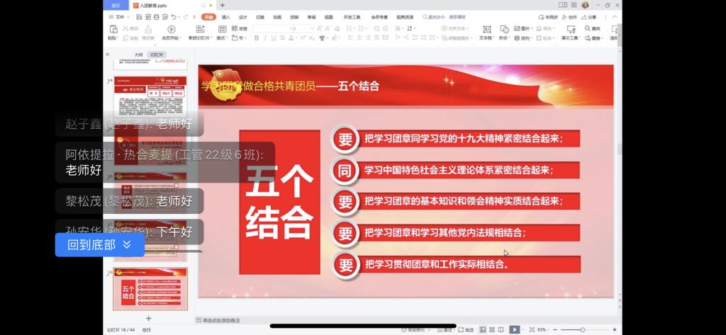 热纳汗·阿布力米提带领2022级新生学习了党领导下的青年运动史,追溯了中国共产主义青年团的历史沿革。她向同学们介绍了学校的团组织情况、团组织架构,详细解读了共青团的性质、指导思想、奋斗目标,与参会同学一起学习了团章,了解了团员发展的流程和要求,明确了团员的义务和责任。