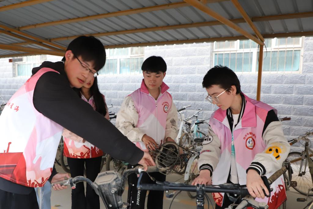 活动中,志愿者们穿着粉色志愿服马甲,分工明确,配合有序,有人负责清理废旧自行车,有人负责清理车棚杂物,有人负责将车辆整齐摆放,有人负责在路口处引导新来车辆有序摆放,志愿者们用实际行动带动了后来车辆有序摆放。另外,志愿者们还向往来同学们宣传文明校园、文明城市的理念,呼吁同学们参与到文明创建工作中来。