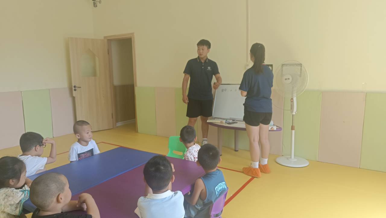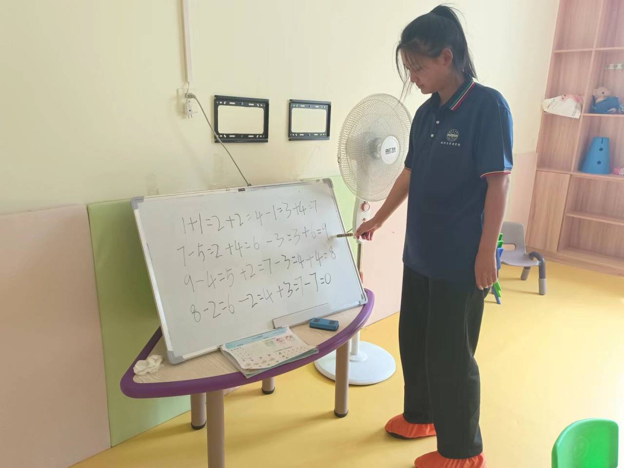 实践队员李希夷和吴鑫燕以二人对话告诉小朋友们正确的声母读法以及带着小朋友们读出正确的发音。实践队员李文静通过数字连加的方式锻炼小朋友们的数学思维能力以及对二十以内加减法的融会贯通。实践队员阿热孜古丽在书写声母和韵母的组合,通过图文结合的形式加强小朋友们对这个发声的形象化,将小朋友的想象力从此引发出来